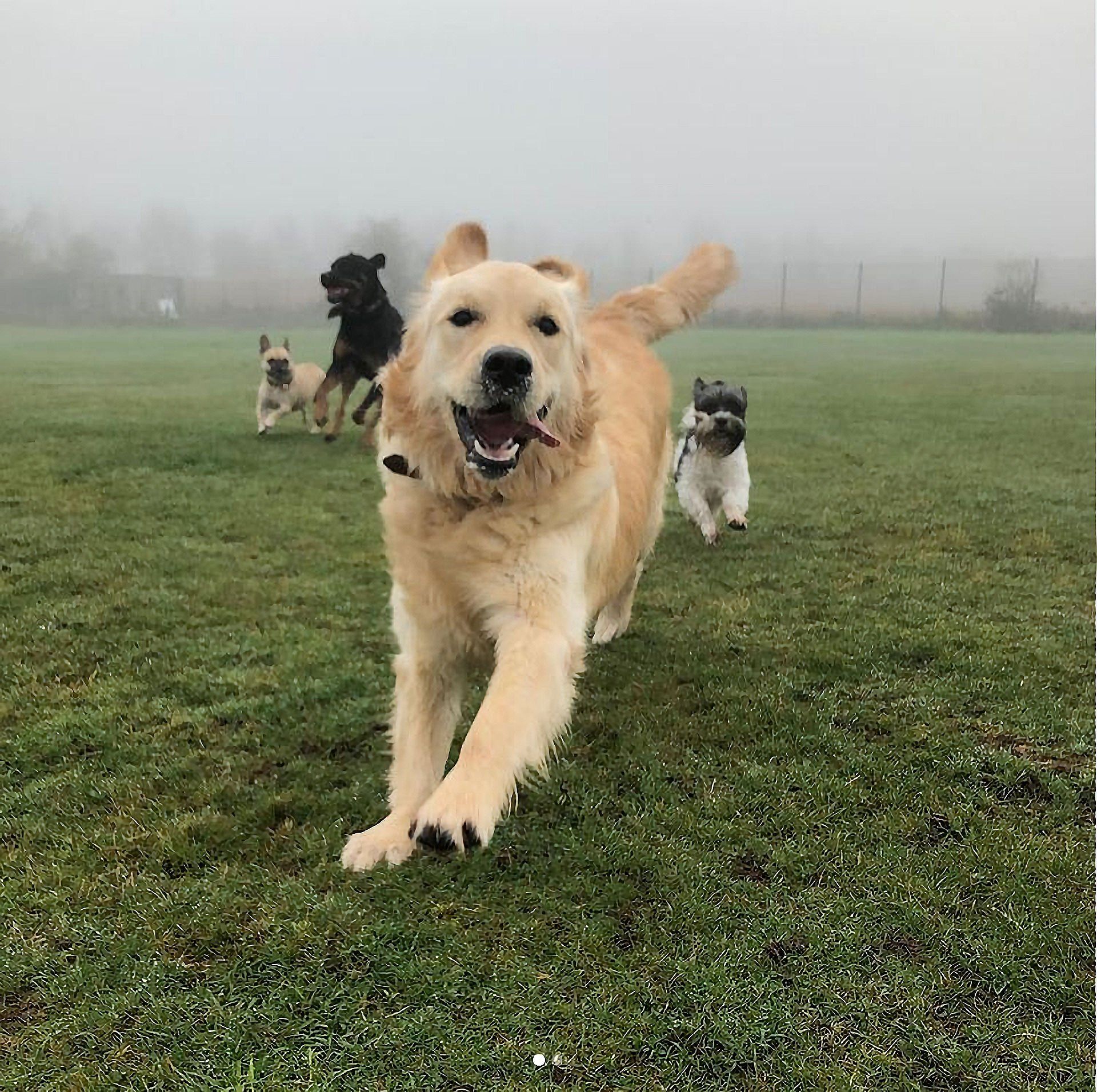 It gives doggie owners a guilt free day off to go to work or shop or play themselves. Only to realise that their dogs had the best day out too. The dogs are frantic, pulling from the boot of the car to come in, they go home happy and tired after having endless fun with all their like minded dog friends, they have two to three long bursts of fun on our huge walking field and are supervised playing with their friends in our two separate astroturf play areas.